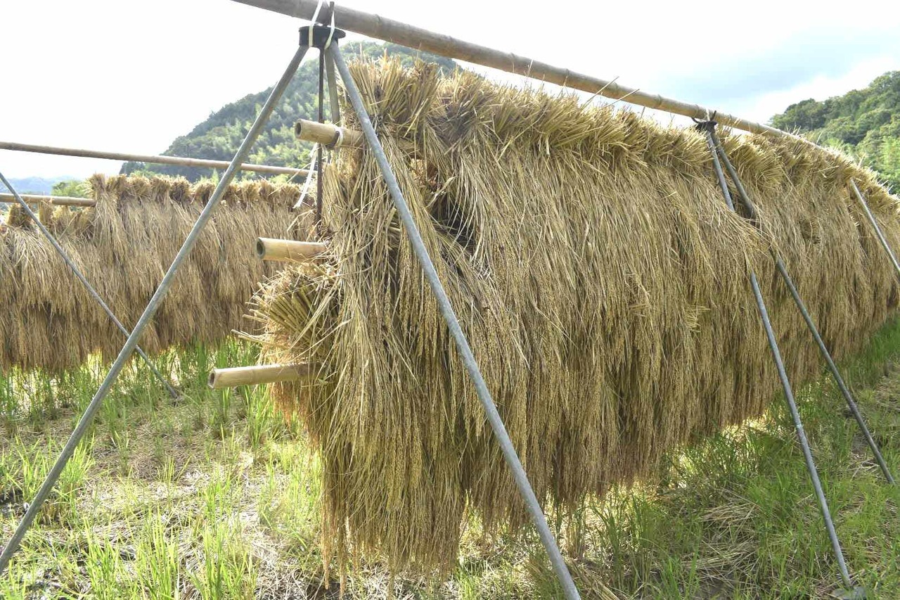 稲刈りした後は天日干しして、お米を自然に乾燥させます。自然にじっくり乾燥する過程で追熟するので、甘みと旨味が倍増します。